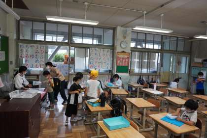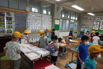写真は朝の準備をする1年生です。家庭学習も頑張っていますね。