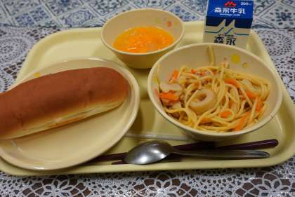 今日の献立は、焼きスパゲティ、ベビーパン、オレンジパンチ、牛乳です。