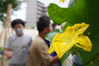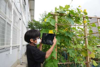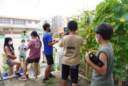 5年2組の理科です。タブレットでヘチマの花を撮影中です。教室に戻ってから、観察記録をまとめます。