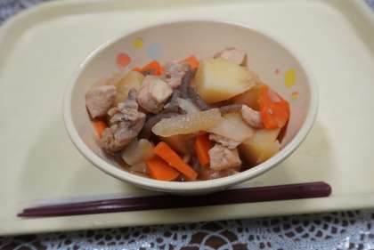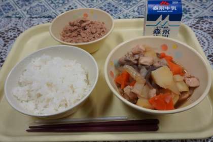 今日の献立は、とりじゃが、シーチキンのそぼろ煮、ご飯、牛乳です。