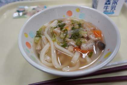 今日の給食が、肉きざみうどん、夏野菜のかき揚げ、ベビーパン、プチチーズ、牛乳です。