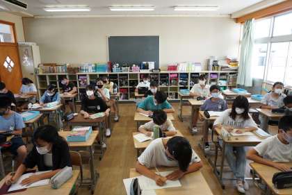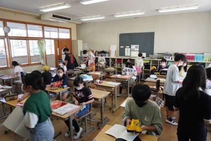 朝の準備をする6年1組、2組です。