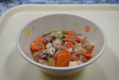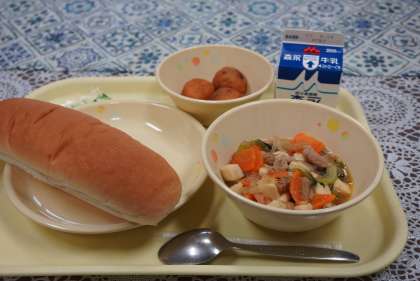 今日の献立は、豆腐のチャンプル、コッペパン、マーガリン、米粉たこ焼き、牛乳です。たこ焼きは子どもたちにも大人気でした。さすが、大阪です。