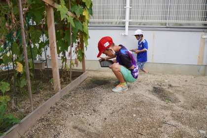 1年1組は生活科です。秋の「生き物」を探していますが、なかなか昆虫が見つけられません。