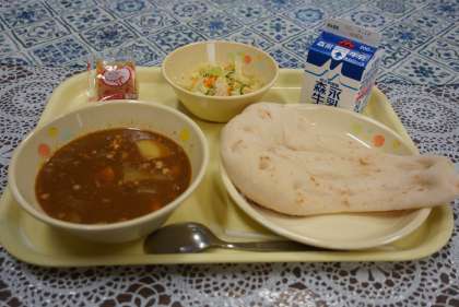 今日の献立は、キーマカレー、ナン、棒棒鶏サラダ、ごまドレッシング、牛乳です。