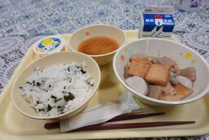今日の献立は、わかめご飯、鶏肉と里芋のゴマ煮、みそ汁、牛乳です。