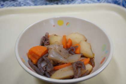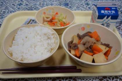 今日の献立は、肉じゃが、ご飯、野菜炒め、塩昆布、牛乳です。