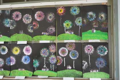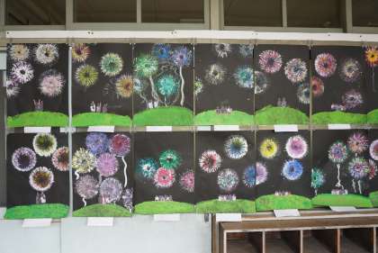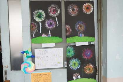 図工の時間に取り組んでいた「花火」が完成!教室前で撮影しました。