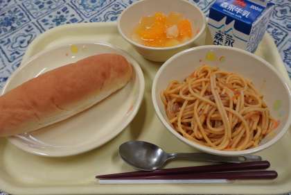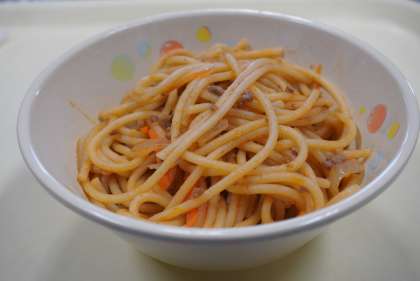 今日の献立は、スパゲティミートソース、ベビーパン、フルーツカクテル、牛乳です。子どもたちに人気のメニューです。