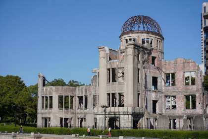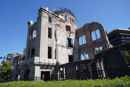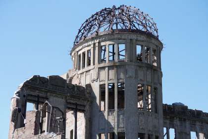 もともとは「広島県産業奨励館」と呼ばれていました。昭和20年8月6日、建物の西隣に位置する相生橋を投下目標として原子爆弾が投下され、建物を強烈な熱線と秒速440メートル以上の爆風が襲いかかりました。建物は、原爆炸裂後1秒以内に3階建ての本体部分がほぼ全壊しましたが、中央のドーム部分だけは全壊を免れ、奇跡的に枠組みと外壁を中心に残存しました。被爆50年にあたる平成7年に国の史跡に指定され、翌年12月5日には、ユネスコの世界遺産(文化遺産)への登録が決定されました。