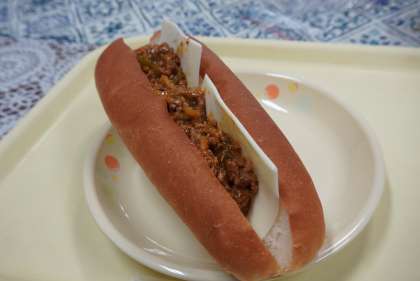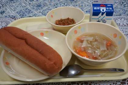 今日の献立は、ミートソース、切り目入りコッペパン、スライスチーズ、野菜スープ、牛乳です。