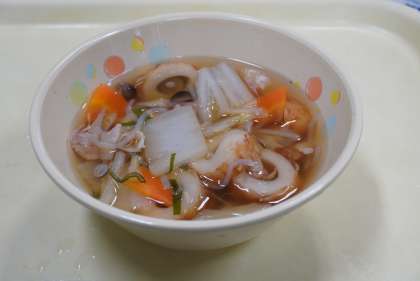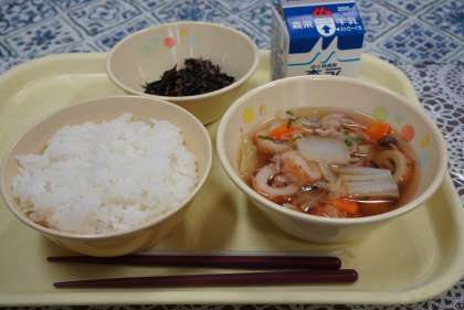 今日の献立は、牛ひじきそぼろ、ご飯、きりたんぽ風、牛乳です。