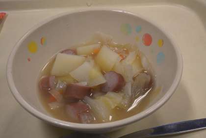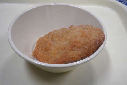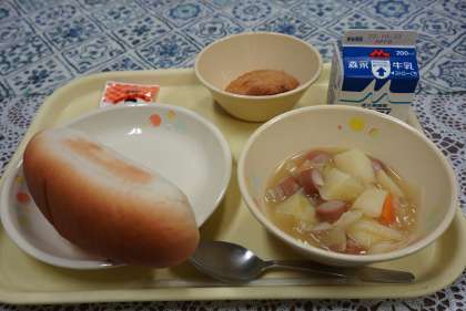 今日の献立は、コッペパン、ジャガイモのスープ煮、サーモンフライ、ミルクバター、牛乳です。
