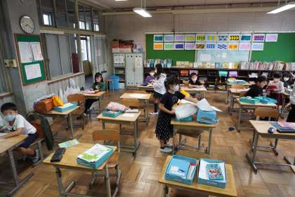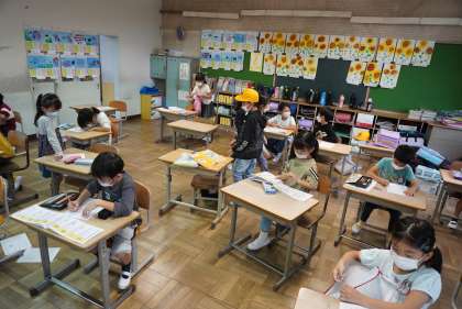 朝の準備をする2年1組、2組です。
