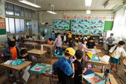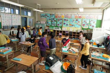 写真は朝の準備をする1年1組、2組です。