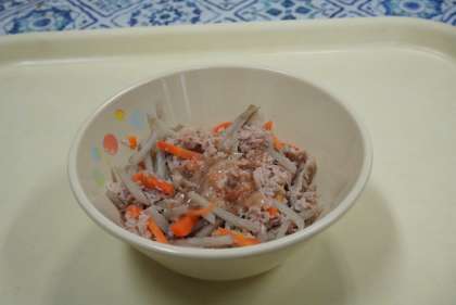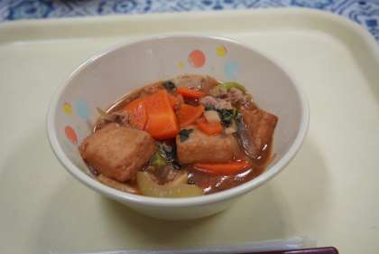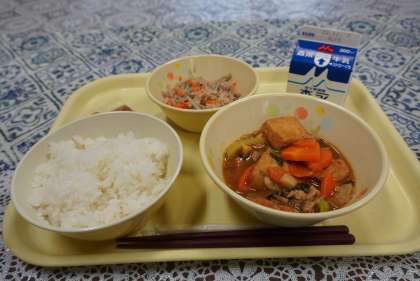 今日の献立は、厚揚げの五目炒め煮、ご飯、ごぼうサラダ、ごまドレッシングです。