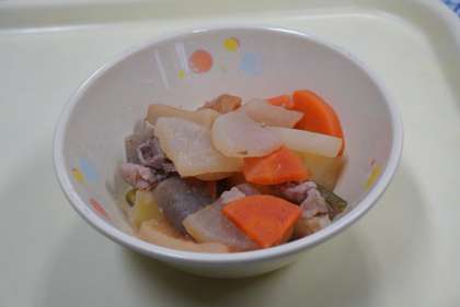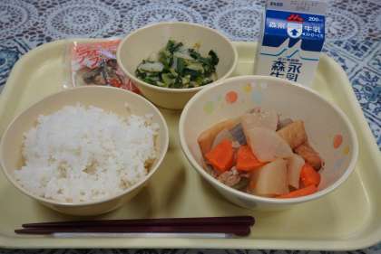 今日の献立は、味噌おでん、ごま和え、ご飯、アーモンドミニフィッシュ、牛乳です。