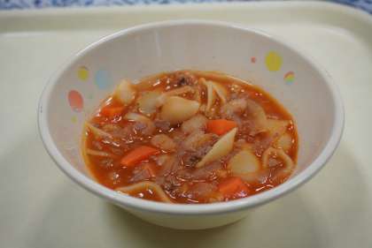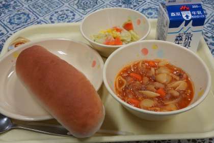 今日の献立は、チリコンカーン、コッペパン、洋風野菜炒め、バター、牛乳です。