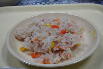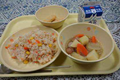 今日の献立は、ツナコーンライス、ポトフ、豆腐ナゲット、牛乳です。