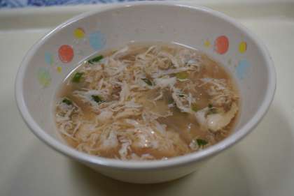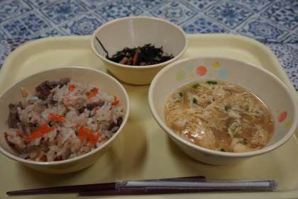 今日の献立は、かきたま汁、肉めし、ひじきの炒め煮、牛乳です。