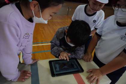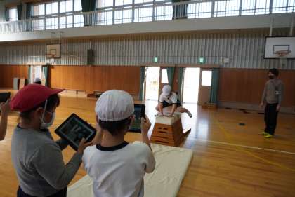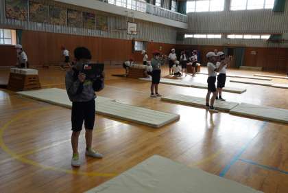 体育の授業です。タブレットを使って撮影し、手のつく位置や足の上がり方などお互いにアドバイスし合ってました。