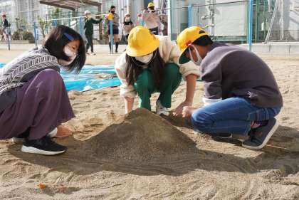 無言で砂山を作る6年生です。