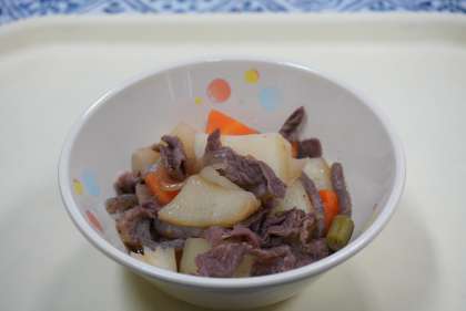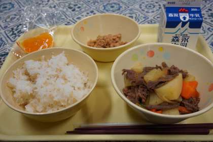 今日の献立は、ツナ大豆ふりかけ、玄米ご飯、肉じゃが、夢オレンジ、牛乳です。