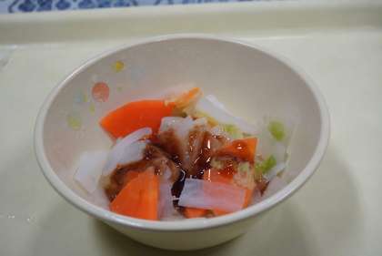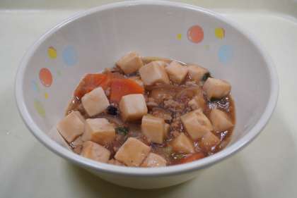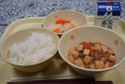 今日の献立は、麻婆豆腐、ご飯、冬野菜のサラダ、和風ドレッシング、牛乳です。