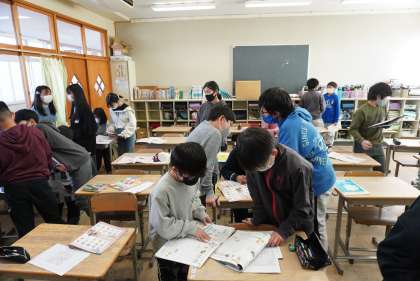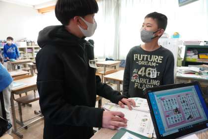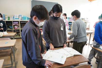 6年2組です。外国語の授業です。小学校生活で一番思い出に残ったことを、英語を使って相手に伝えています。