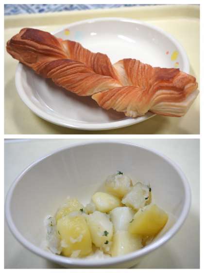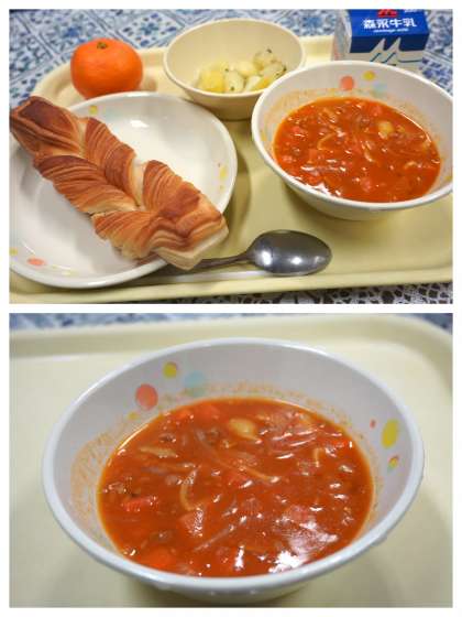 今日の献立は、デニッシュパン、チリコンカーン、じゃがバター、みかん、牛乳です。