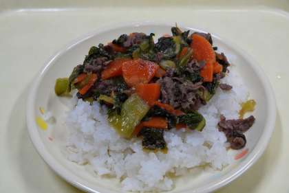 今日の献立は、ビビンバ、ご飯、卵トック、牛乳です。特にビビンバはニンニクの風味もよく、とてもおいしくいただけました。