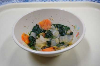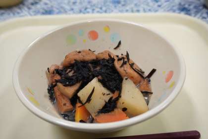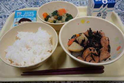 今日の献立は、いそ煮、おかか和え、ご飯、ふりかけ、牛乳です。ご飯がとてもおいしくいただける献立です。