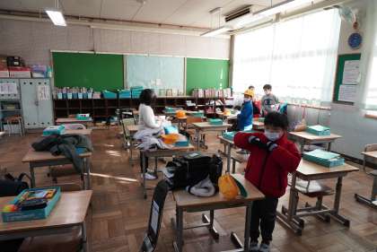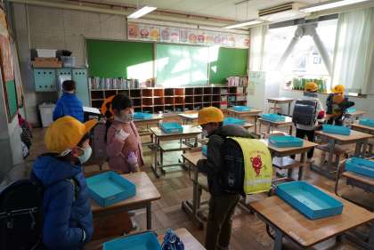 写真は登校してきた1年1組と2年1組の児童です。今日も寒いですが、一日頑張りましょう。