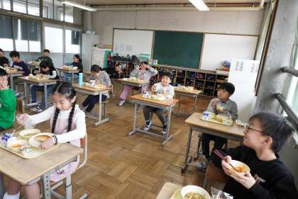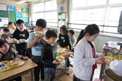 3年1組です。カレーうどんのおかわりは大人気です。
