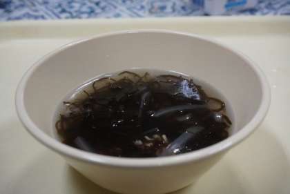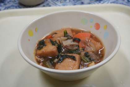 今日の献立は、厚揚げの五目炒め煮、もずくスープ、ご飯、アーモンドフィッシュ、牛乳です。