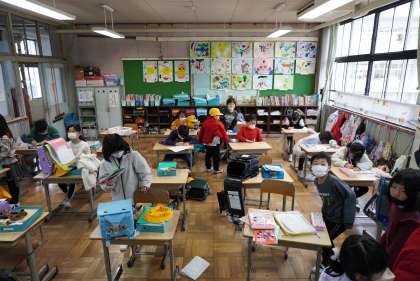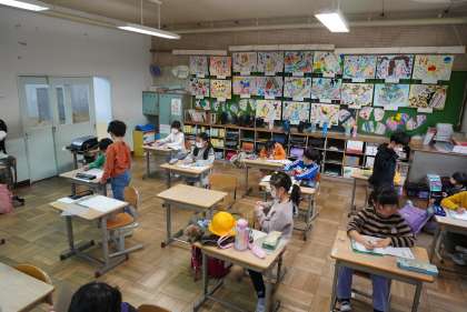 朝の準備をする2年1組と2組です。