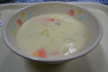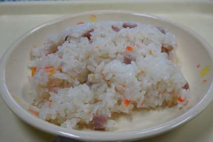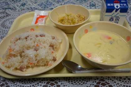 今日の献立は、ハムピラフ、ポタージュスープ、大豆の花サラダ、ノンエッグマヨ、牛乳です。