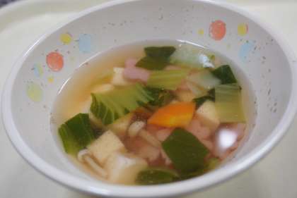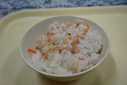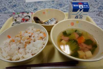 今日の給食はひな祭りバージョンです。ちらし寿司、すまし汁、サンマの煮つけ、ひなあられ、牛乳です。とてもおいしかったです。
