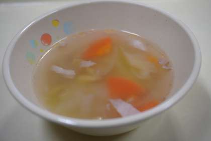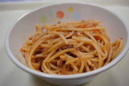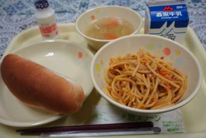 今日の献立は、ベビーパン、豆ミートスパゲティ、野菜スープ、飲むヨーグルト、牛乳です。