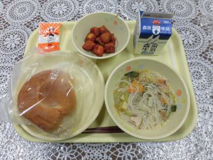 今日の給食メニューは、しるビーフン・まぐろのケチャップあえ・うずまきパン・ミルクバター・牛乳です。まぐろには、タンパク質・鉄分・ビタミンDなど、体に良い栄養が多く含まれ、また、頭の働きを良くし、血液をサラサラにする栄養が含まれています。