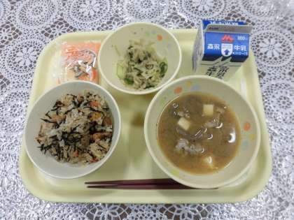 今日の給食メニューは、ひじき大豆ごはん・切り干し大根のごまあえ・豚汁・アーモンドミニフィッシュ・牛乳です。ひじきは、昆布やわかめ、海苔と同じ海藻の仲間で、お腹の中をきれいにする食物繊維や、骨や歯をつくり丈夫にするカルシウム、血を作るもととなる鉄分などのミネラルが多く含まれています。
