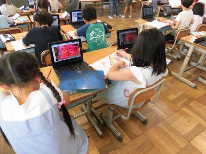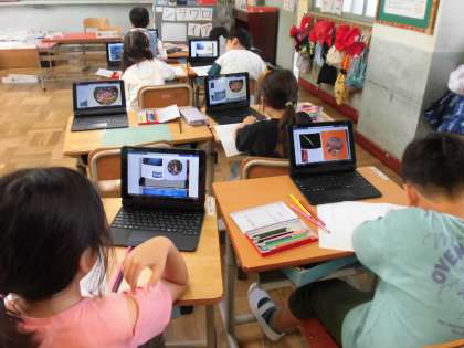 1年生の国語の学習「うみのかくれんぼ」。海の中のいろいろな生き物ついて、自分で調べて、絵や文にかいてまとめています。