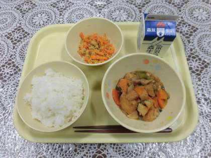 今日の給食メニューは、厚揚げの五目炒め煮・にんじんしりしり・ごはん・牛乳です。「にんじんしりしり」は沖縄県の郷土料理で、にんじんをたくさん使った炒め物で、「しりしり」とは、沖縄県の方言で「せん切り」を意味するそうです。