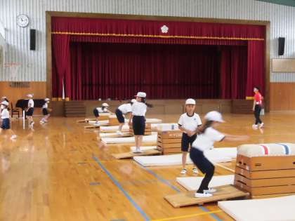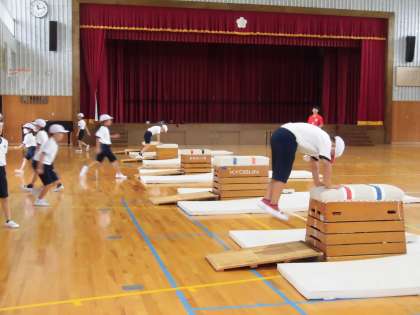 3年生の体育の学習です。互いに技のポイントをアドバイスし合いながら、跳び箱の「台上前転」に挑戦しています。
