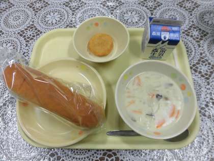 今日の給食メニューは、ホワイトシチュー・キャロットパン・コーンコロッケ・牛乳です。ホワイトシチューは、牛乳や生クリームをベースに、肉、じゃやがいも、にんじん、玉ねぎなどを煮込んだ料理で、今日の給食には、じゃがいもの代わりにマカロニが入っています。