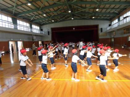 1年生と2年生合同での運動会にむけた練習のようすです。動きを少しずつ覚えていっています。