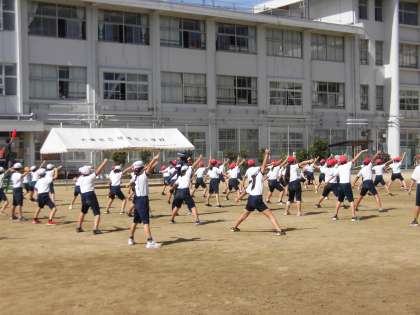 3年生と4年生合同での運動会にむけた練習のようすです。体をいっぱいに伸ばして、大きな動きを意識しています。
