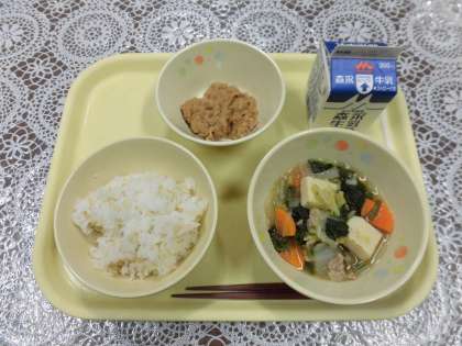 今日の給食メニューは、よせなべ風・玄米ごはん・シーチキンのそぼろ煮・牛乳です。「よせなべ風」は、削り節の出汁で豚肉・焼き豆腐・マロニー・白菜・ほうれん草・にんじんを煮て、塩・しょうゆ・みりんで味付けをして作っています。