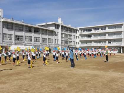 3年生と4年生合同での運動会にむけた練習のようすです。色鮮やかなカラーのフラッグが、青空に映えています。