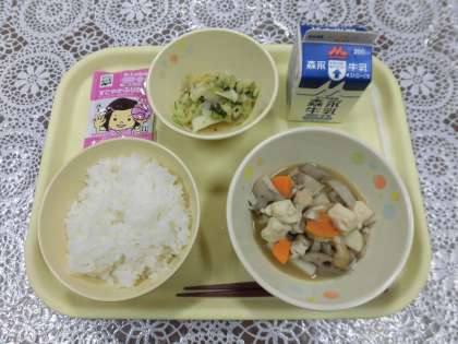 今日の給食メニューは、けんちん煮・ごまあえ・ごはん・ふりかけ・牛乳です。けんちん煮とは、豆腐と季節の野菜を炒めて、だしを加えて煮たもので、今日のけんちん煮には、鶏肉、豆腐、にんじん、大根、れんこん、さといも、うすあげが入っています。